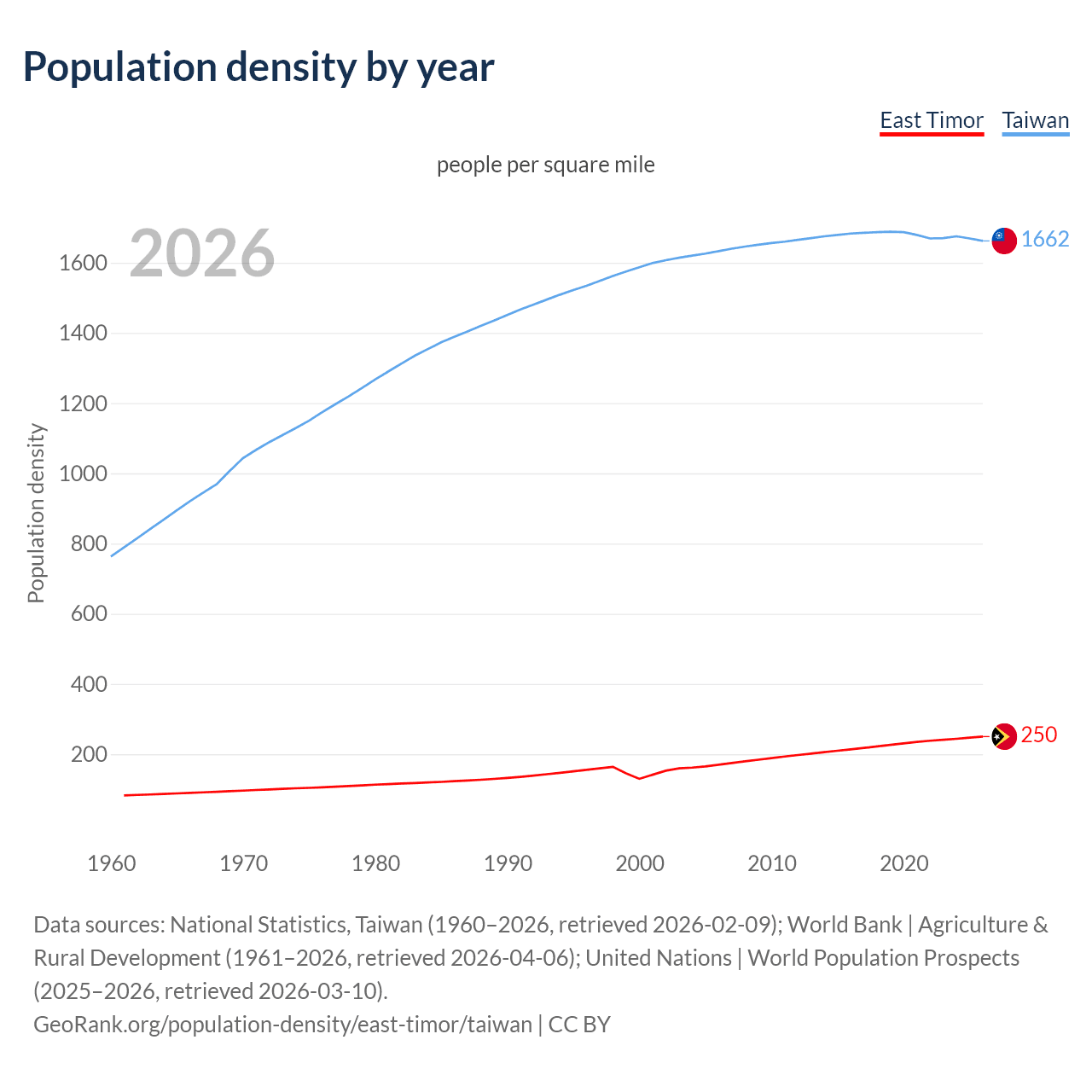 From 2006 to 2026, population density in East Timor increased by 47.1%, compared to a 1.78% growth in Taiwan.