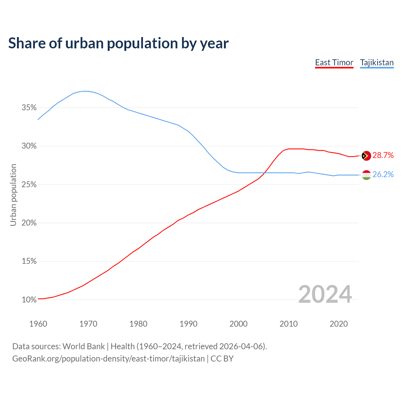From 2004 to 2024, the share of urban population changed from 25.7% to 28.7% in East Timor and from 26.5% to 26.2% in Tajikistan.