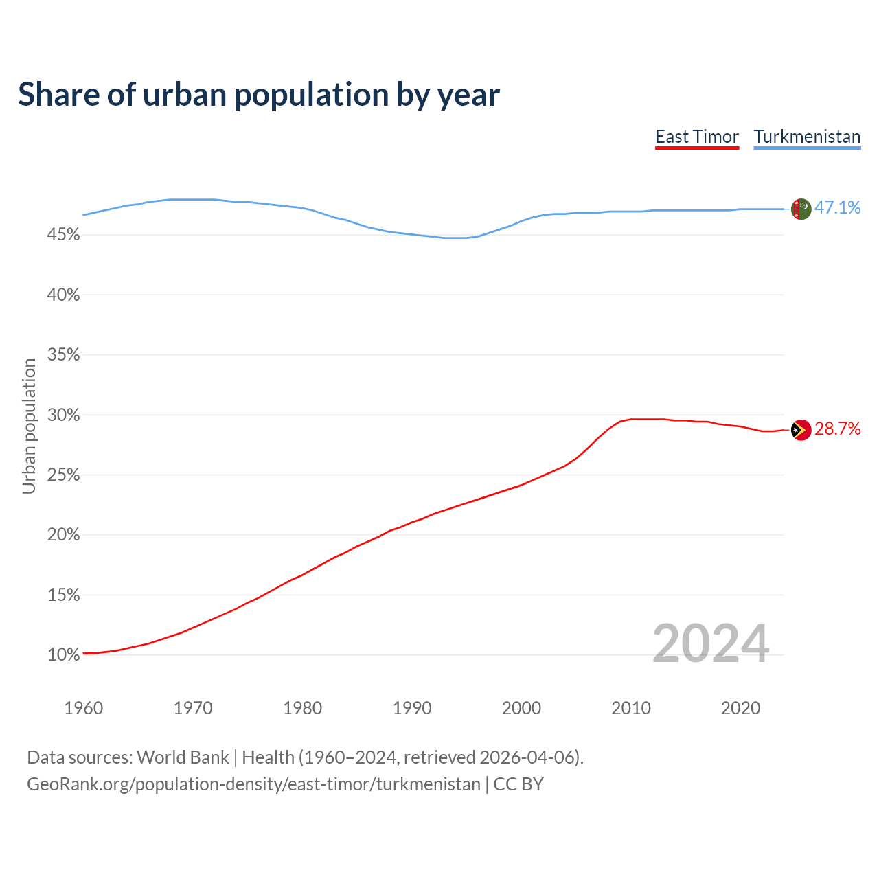From 2004 to 2024, the share of urban population changed from 25.7% to 28.7% in East Timor and from 46.7% to 47.1% in Turkmenistan.