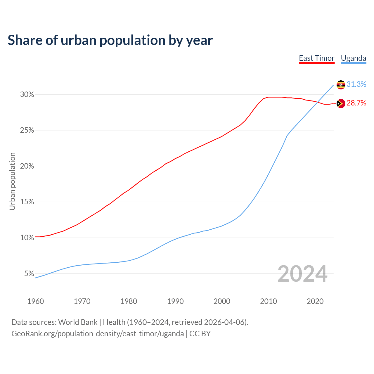 From 2004 to 2024, the share of urban population changed from 25.7% to 28.7% in East Timor and from 13.1% to 31.3% in Uganda.