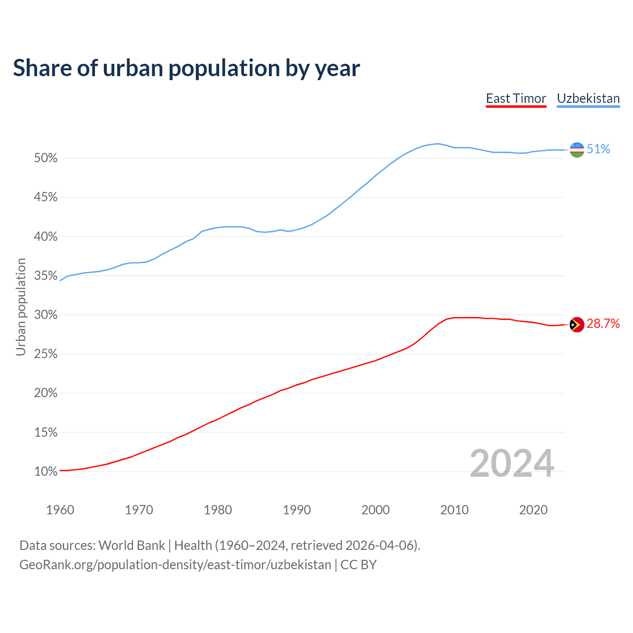 From 2004 to 2024, the share of urban population changed from 25.7% to 28.7% in East Timor and from 50.6% to 51% in Uzbekistan.
