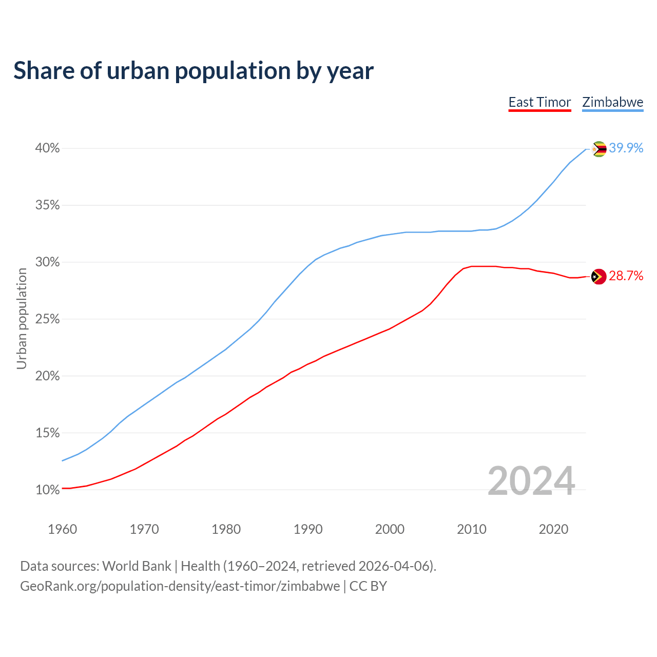 From 2004 to 2024, the share of urban population changed from 25.7% to 28.7% in East Timor and from 32.6% to 39.9% in Zimbabwe.