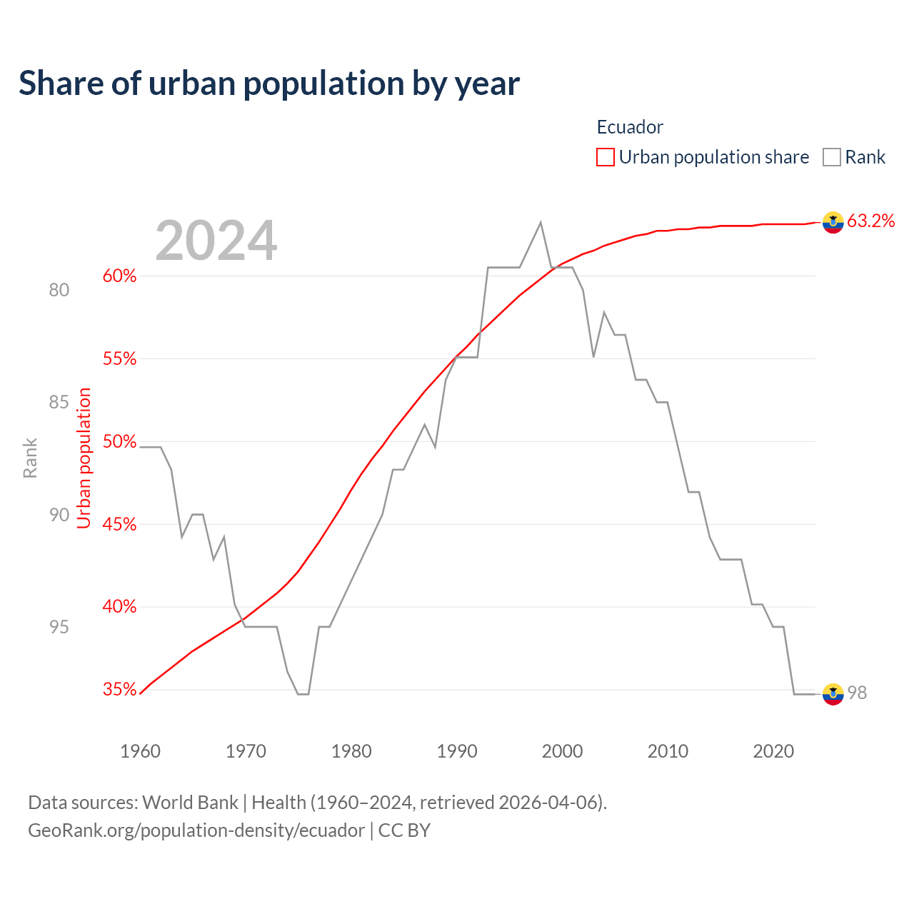 This chart shows the share of urban population in Ecuador from 1960 to 2024: 34.7% lived in urban areas in 1960, 60.7% in 2000, and 63.2% in 2024.