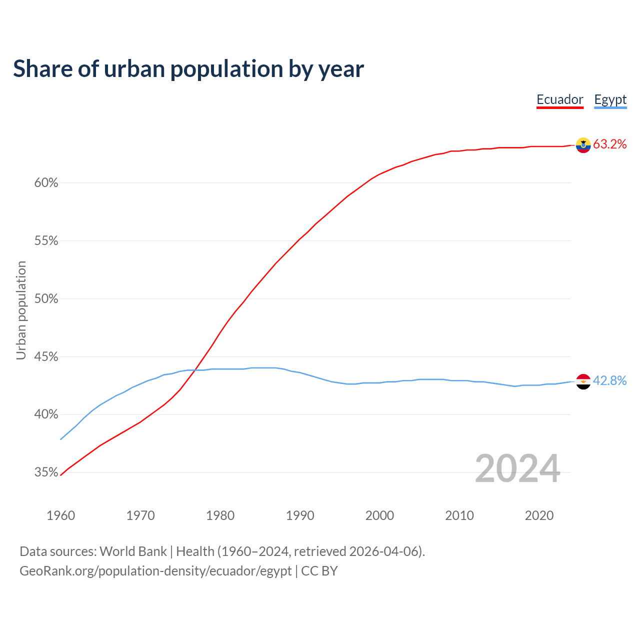 From 2004 to 2024, the share of urban population changed from 61.8% to 63.2% in Ecuador and from 42.9% to 42.8% in Egypt.