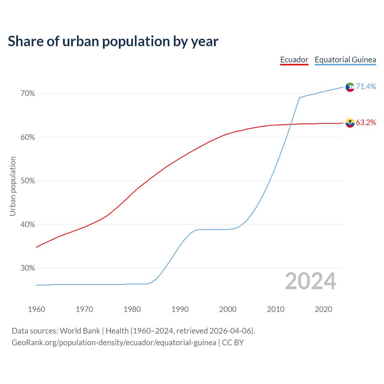 From 2004 to 2024, the share of urban population changed from 61.8% to 63.2% in Ecuador and from 40.9% to 71.4% in Equatorial Guinea.
