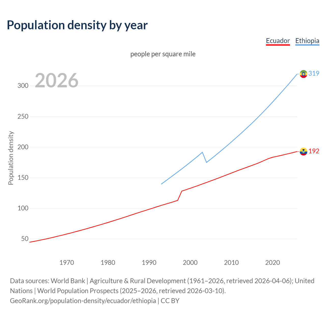 From 2006 to 2026, population density in Ecuador increased by 30.9%, compared to a 72.2% growth in Ethiopia.