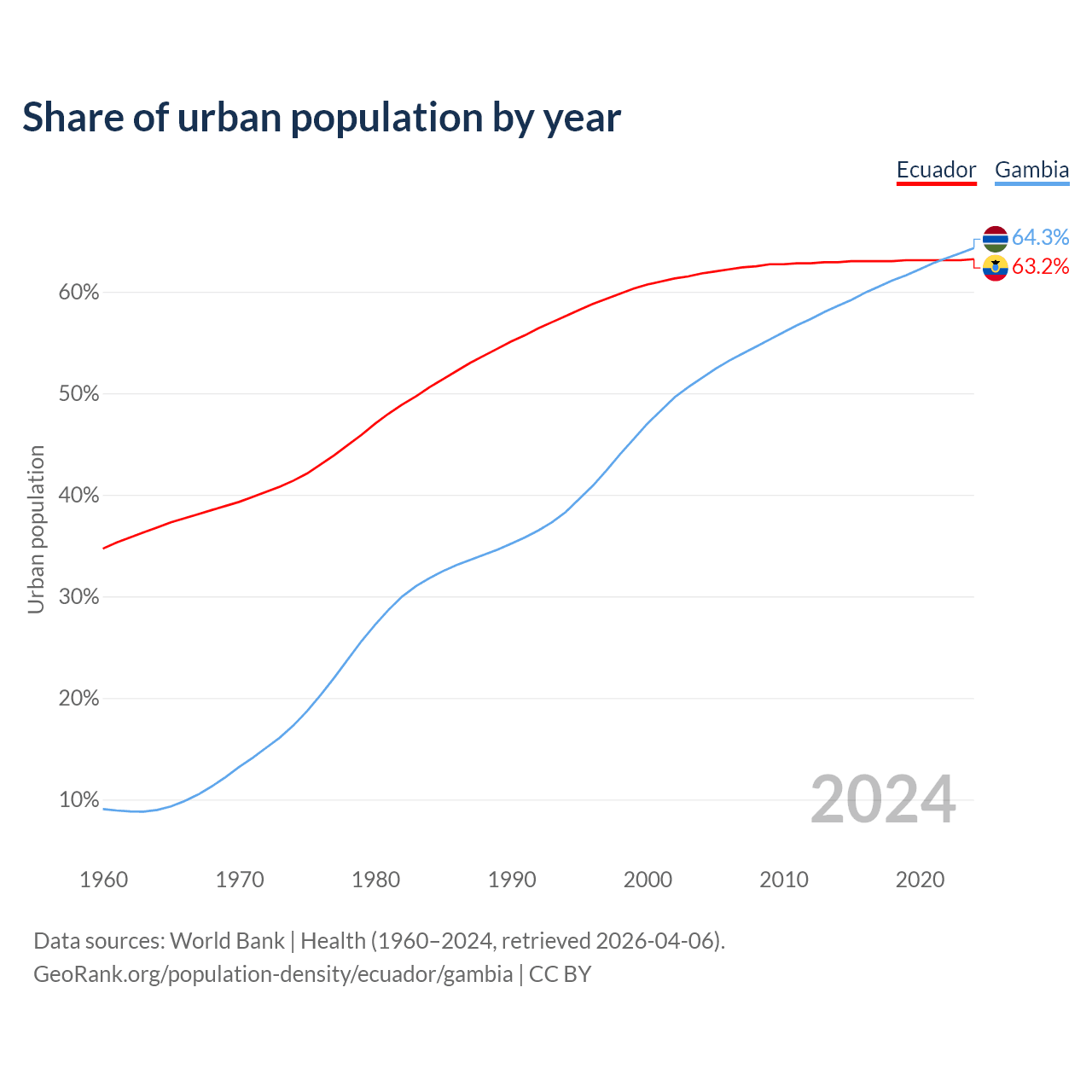 From 2004 to 2024, the share of urban population changed from 61.8% to 63.2% in Ecuador and from 51.5% to 64.3% in the Gambia.