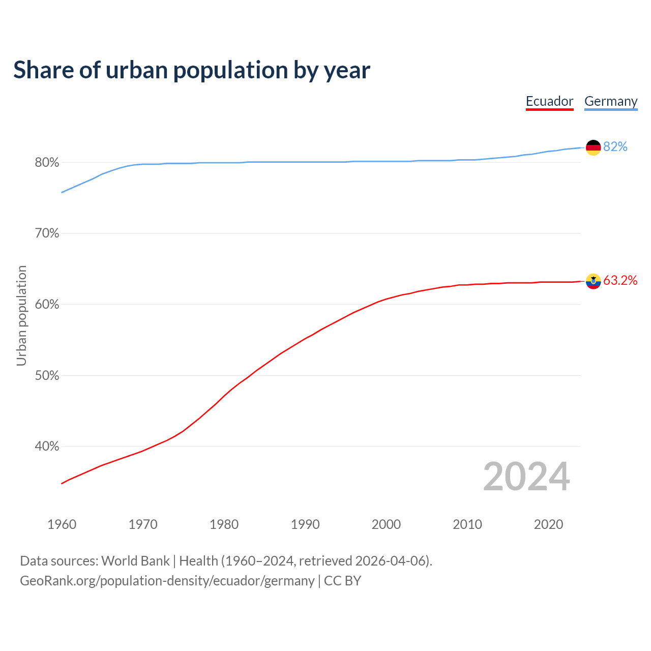 From 2004 to 2024, the share of urban population changed from 61.8% to 63.2% in Ecuador and from 80.2% to 82% in Germany.