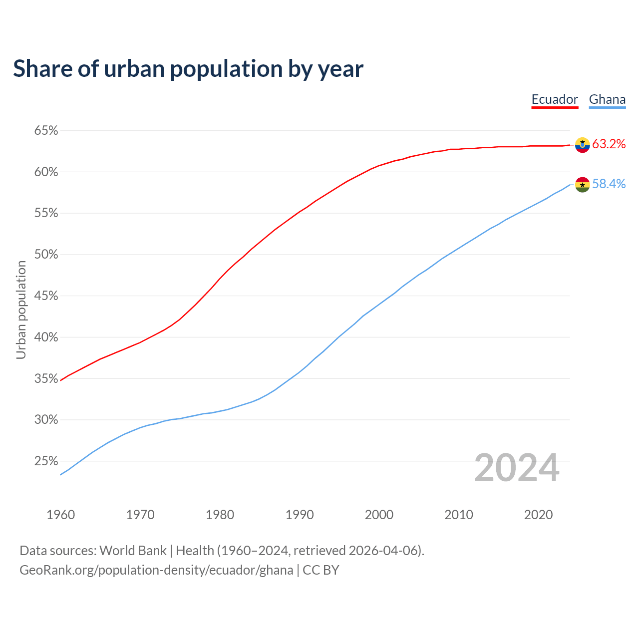 From 2004 to 2024, the share of urban population changed from 61.8% to 63.2% in Ecuador and from 46.8% to 58.4% in Ghana.