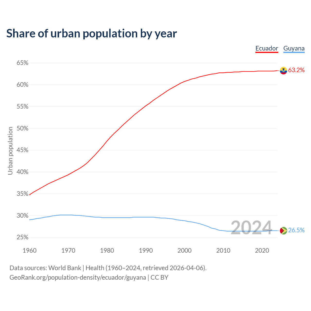 From 2004 to 2024, the share of urban population changed from 61.8% to 63.2% in Ecuador and from 28.1% to 26.5% in Guyana.