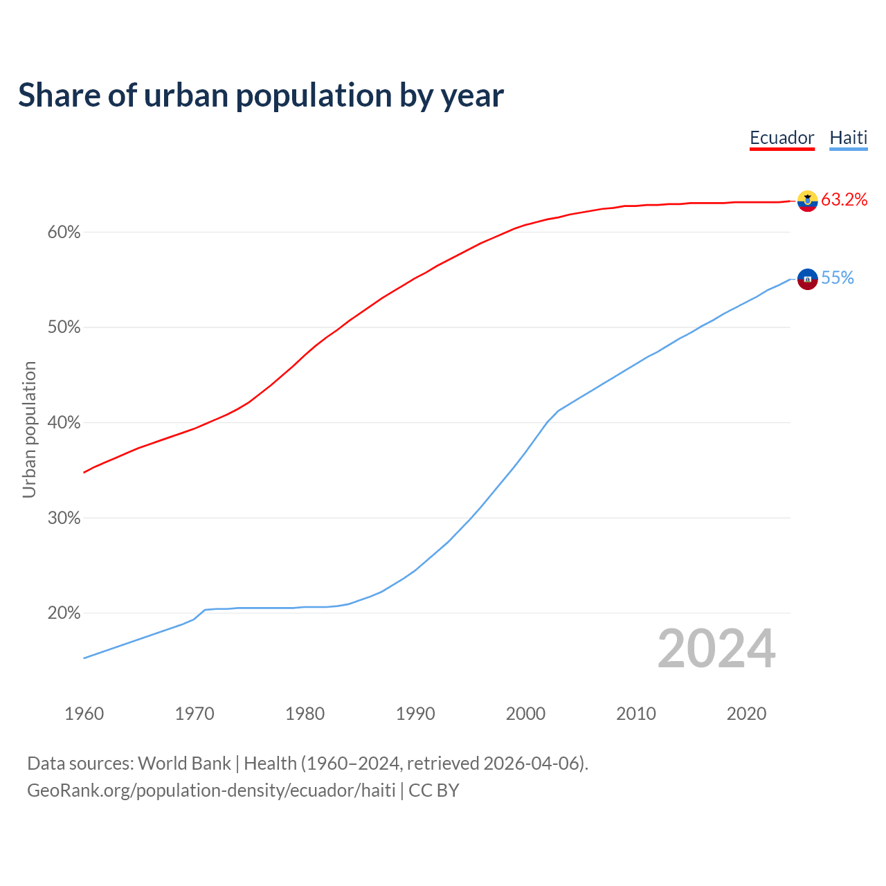 From 2004 to 2024, the share of urban population changed from 61.8% to 63.2% in Ecuador and from 41.9% to 55% in Haiti.