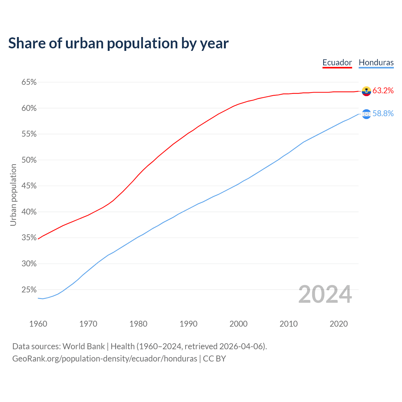 From 2004 to 2024, the share of urban population changed from 61.8% to 63.2% in Ecuador and from 47.6% to 58.8% in Honduras.