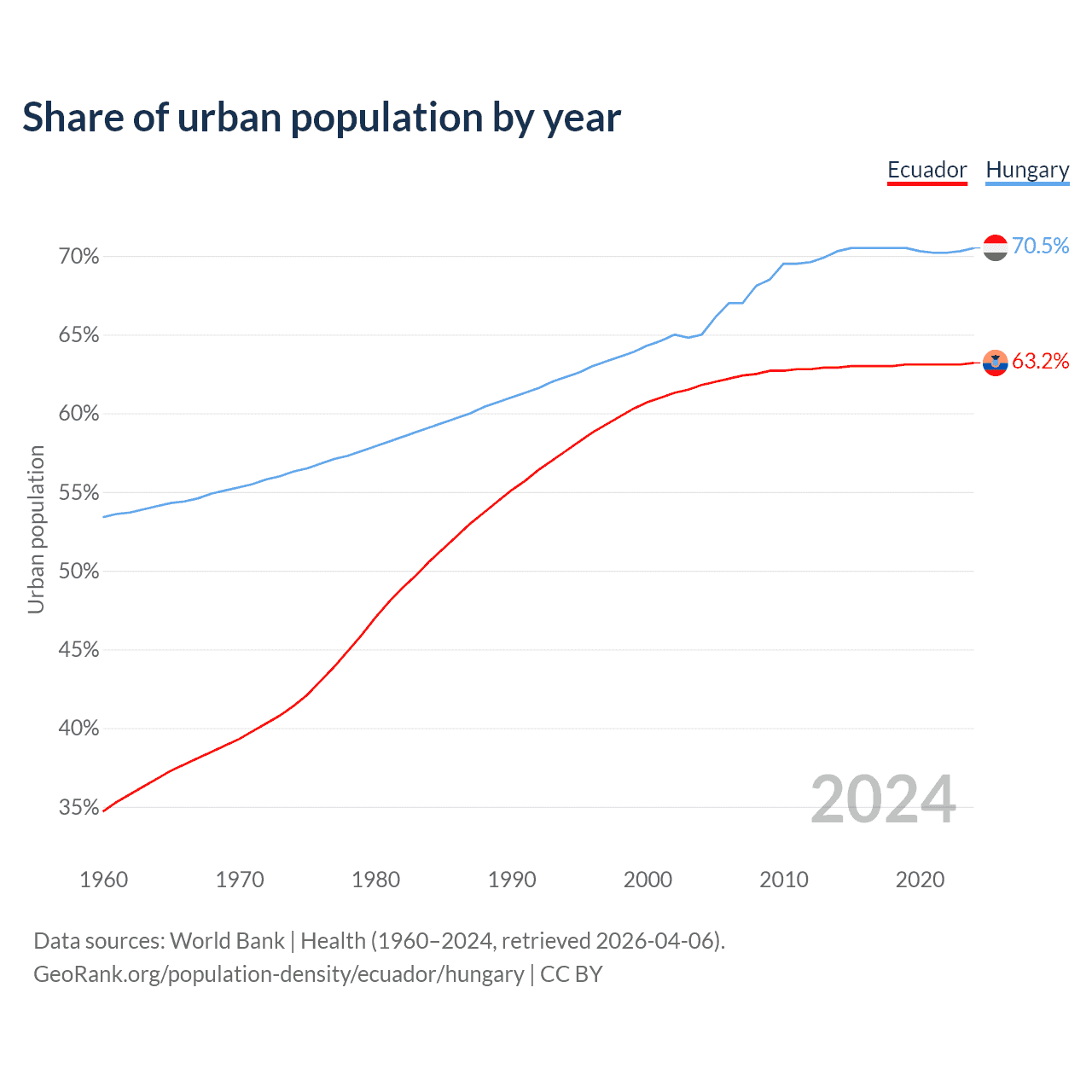 From 2004 to 2024, the share of urban population changed from 61.8% to 63.2% in Ecuador and from 65% to 70.5% in Hungary.
