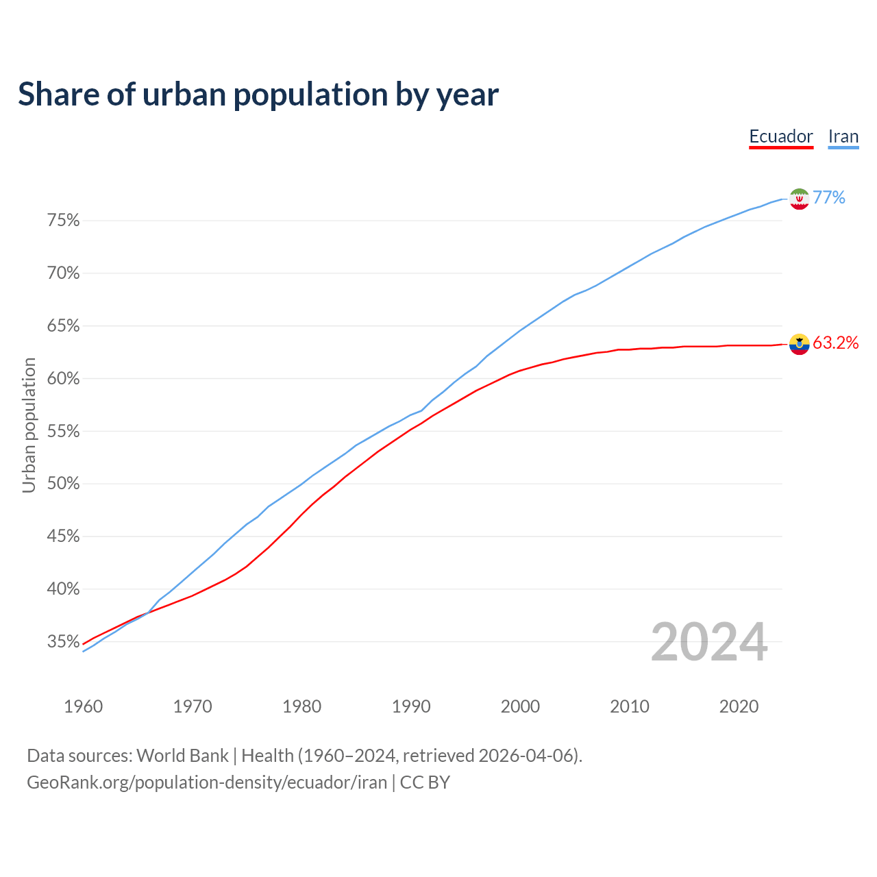 From 2004 to 2024, the share of urban population changed from 61.8% to 63.2% in Ecuador and from 67.3% to 77% in Iran.