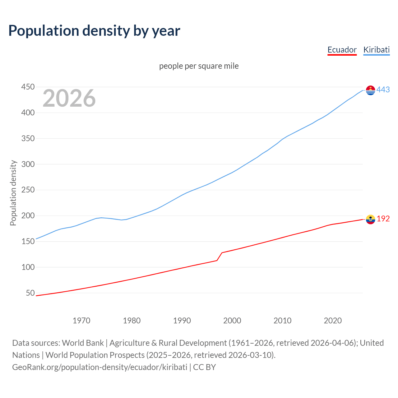 From 2006 to 2026, population density in Ecuador increased by 30.9%, compared to a 38.5% growth in Kiribati.
