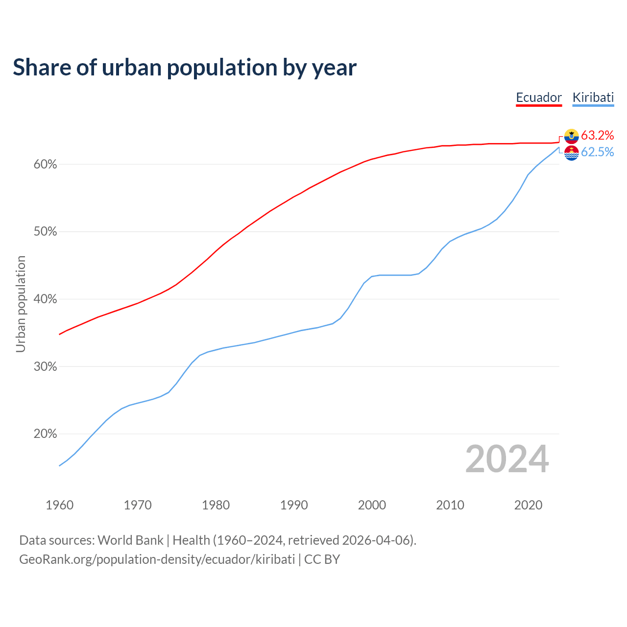 From 2004 to 2024, the share of urban population changed from 61.8% to 63.2% in Ecuador and from 43.5% to 62.5% in Kiribati.
