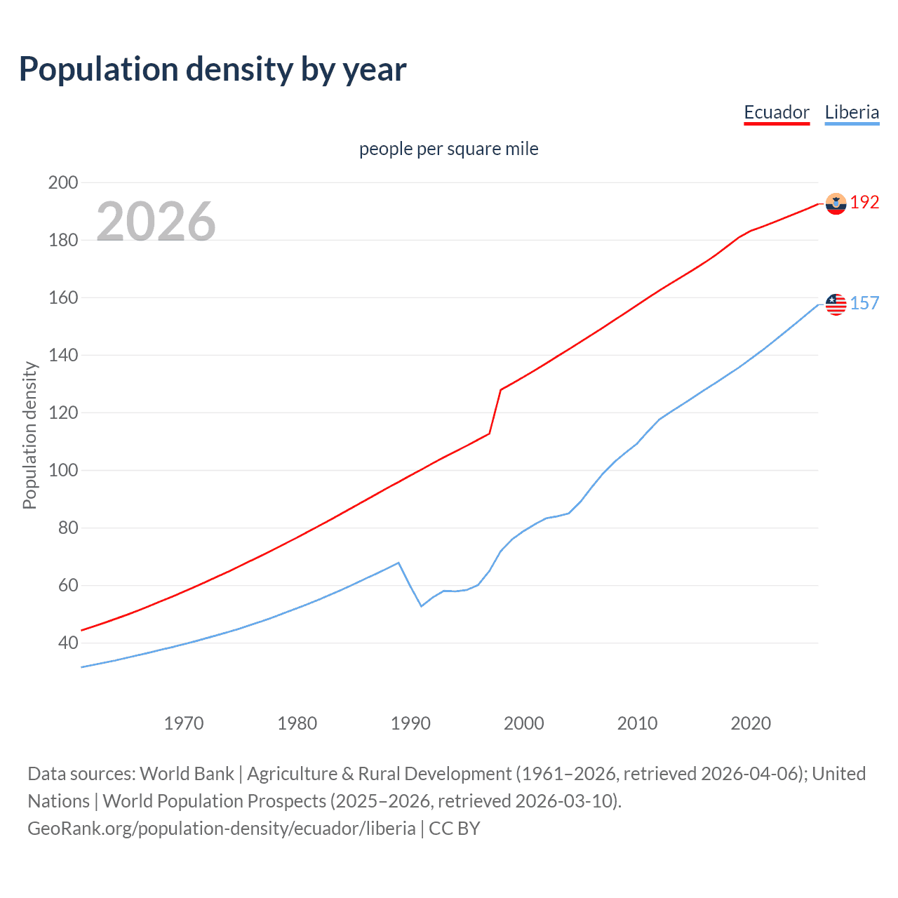 From 2006 to 2026, population density in Ecuador increased by 30.9%, compared to a 67.6% growth in Liberia.