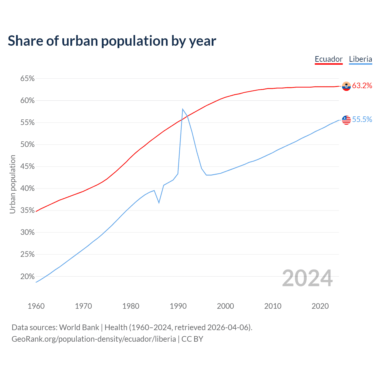 From 2004 to 2024, the share of urban population changed from 61.8% to 63.2% in Ecuador and from 45.4% to 55.5% in Liberia.