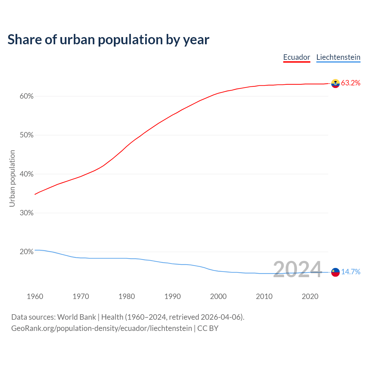 From 2004 to 2024, the share of urban population changed from 61.8% to 63.2% in Ecuador and from 14.7% to 14.7% in Liechtenstein.