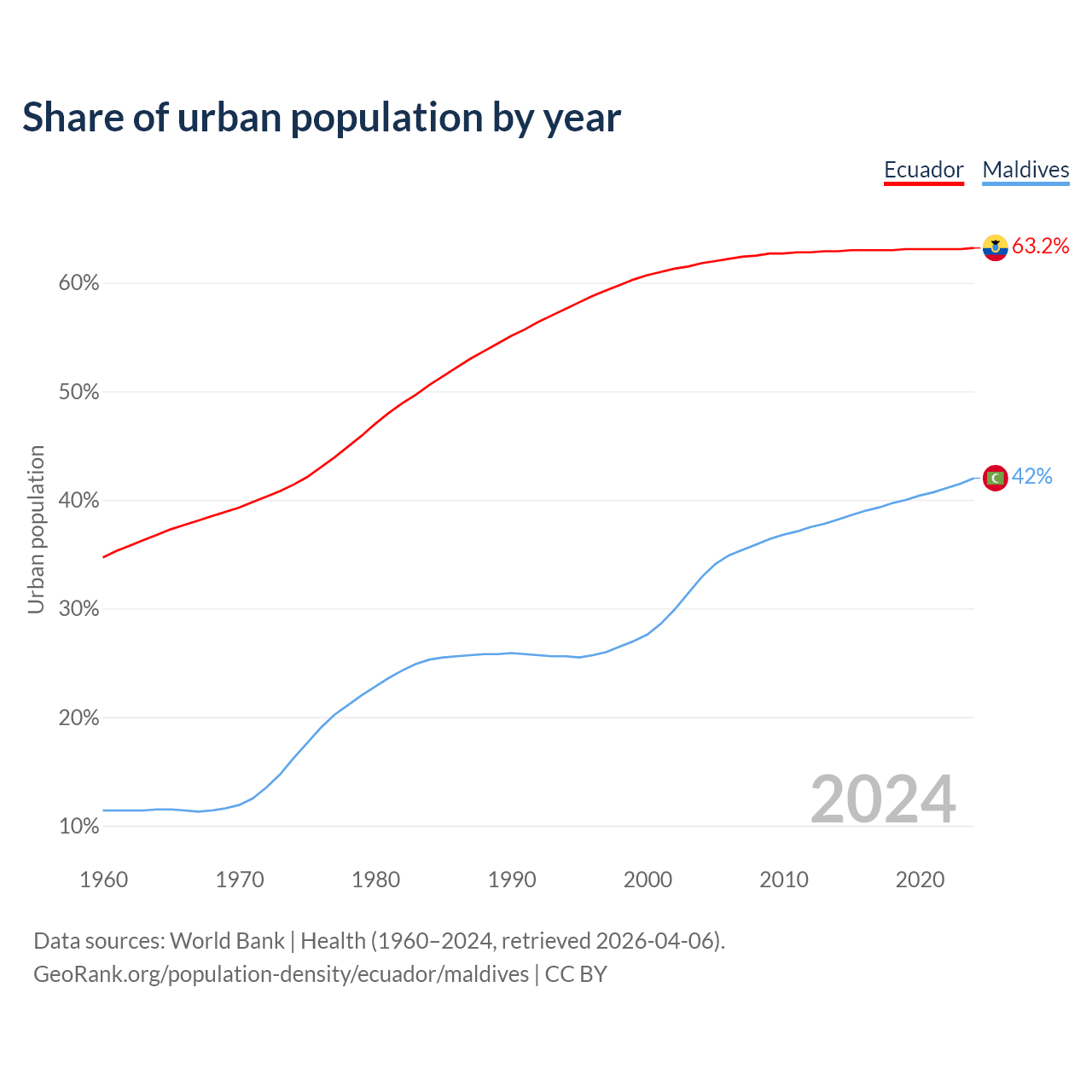 From 2004 to 2024, the share of urban population changed from 61.8% to 63.2% in Ecuador and from 32.9% to 42% in Maldives.