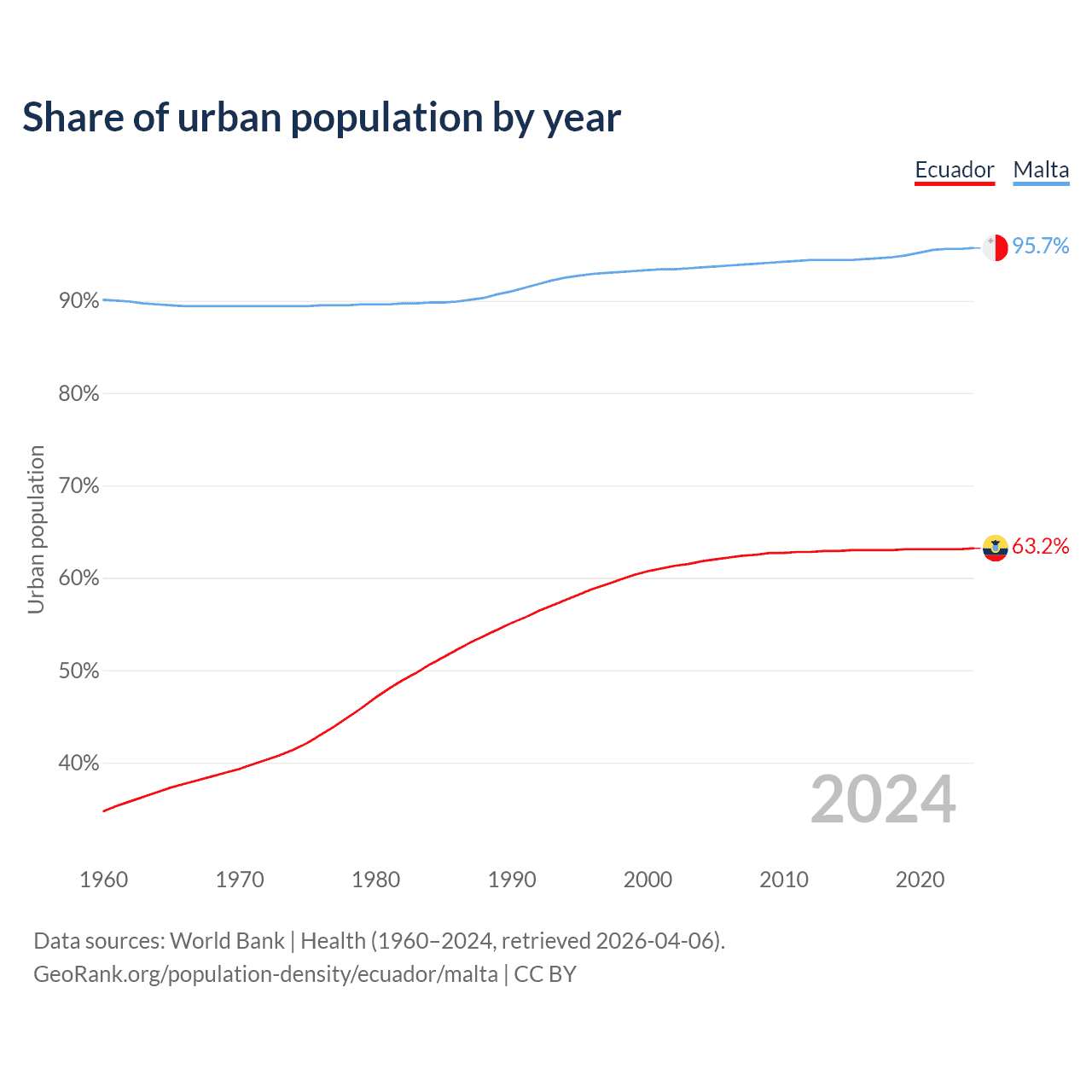 From 2004 to 2024, the share of urban population changed from 61.8% to 63.2% in Ecuador and from 93.6% to 95.7% in Malta.