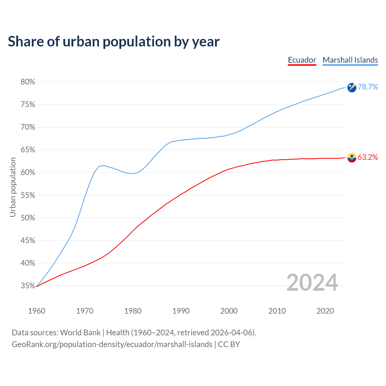 From 2004 to 2024, the share of urban population changed from 61.8% to 63.2% in Ecuador and from 70.1% to 78.7% in the Marshall Islands.