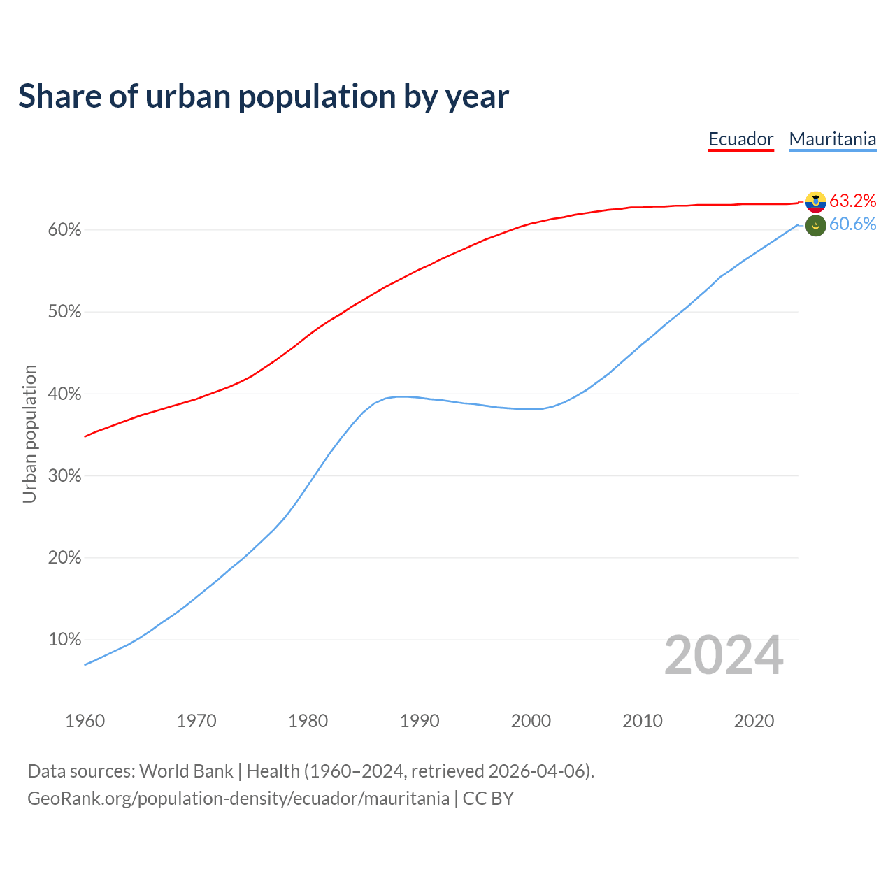 From 2004 to 2024, the share of urban population changed from 61.8% to 63.2% in Ecuador and from 39.6% to 60.6% in Mauritania.