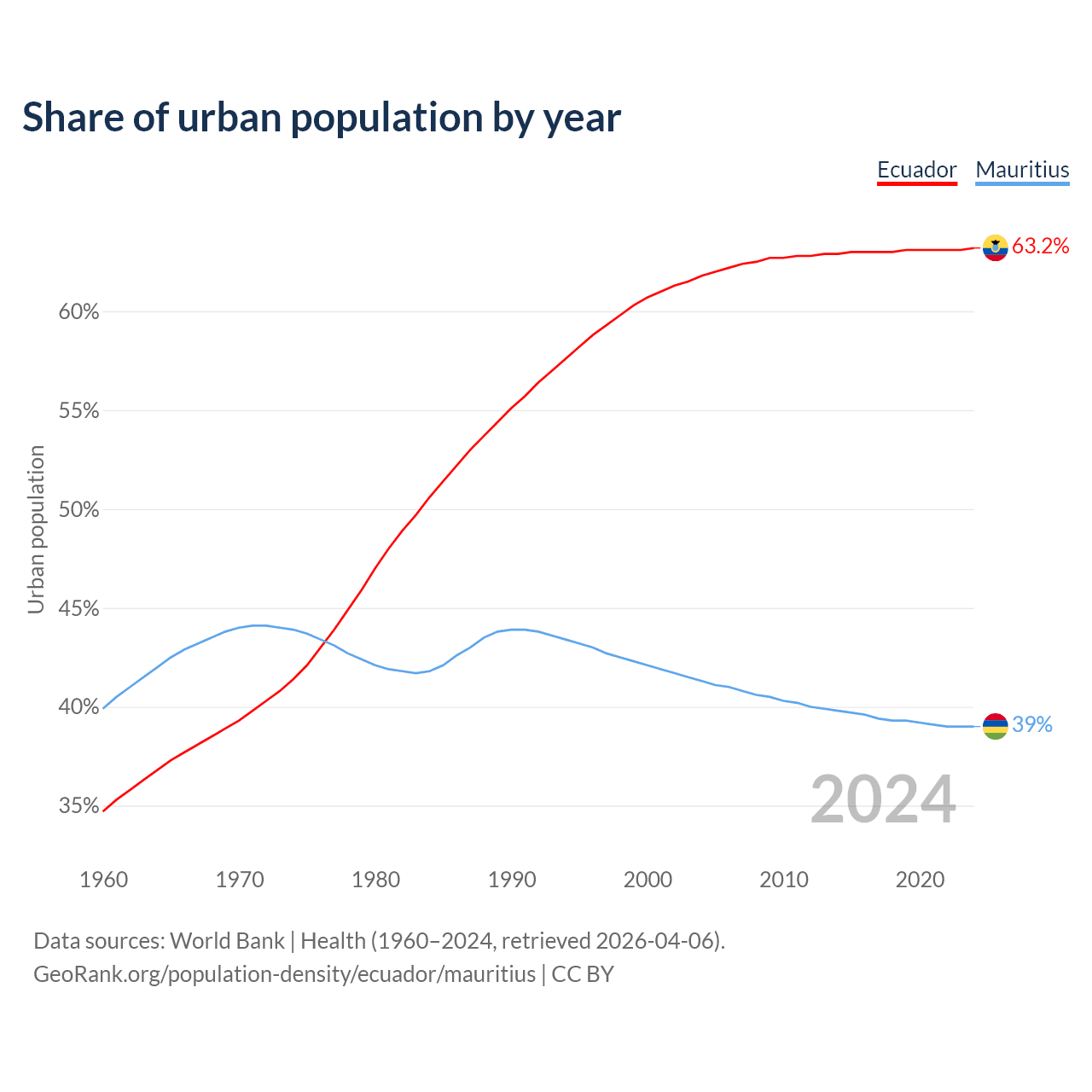 From 2004 to 2024, the share of urban population changed from 61.8% to 63.2% in Ecuador and from 41.3% to 39% in Mauritius.
