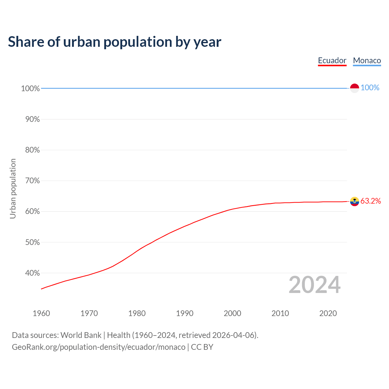 From 2004 to 2024, the share of urban population changed from 61.8% to 63.2% in Ecuador and from 100% to 100% in Monaco.