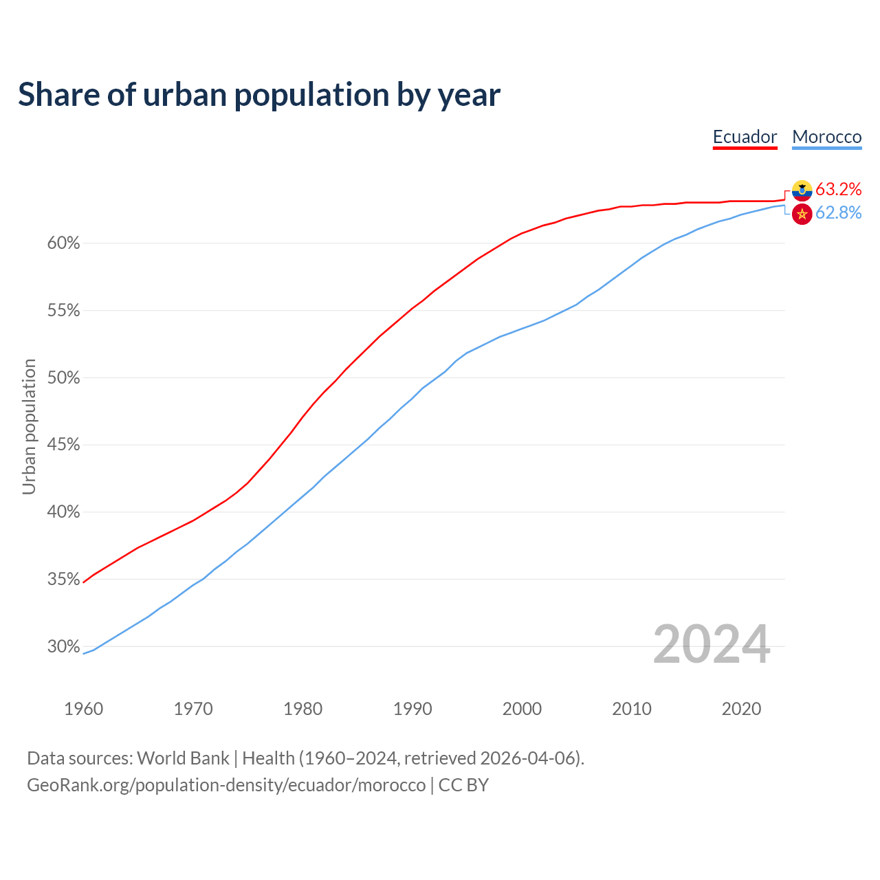 From 2004 to 2024, the share of urban population changed from 61.8% to 63.2% in Ecuador and from 55% to 62.8% in Morocco.