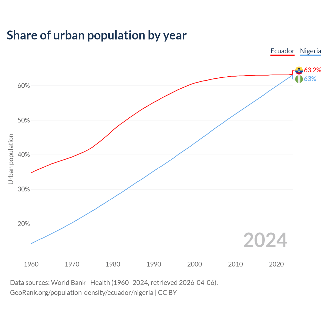 From 2004 to 2024, the share of urban population changed from 61.8% to 63.2% in Ecuador and from 46.7% to 63% in Nigeria.