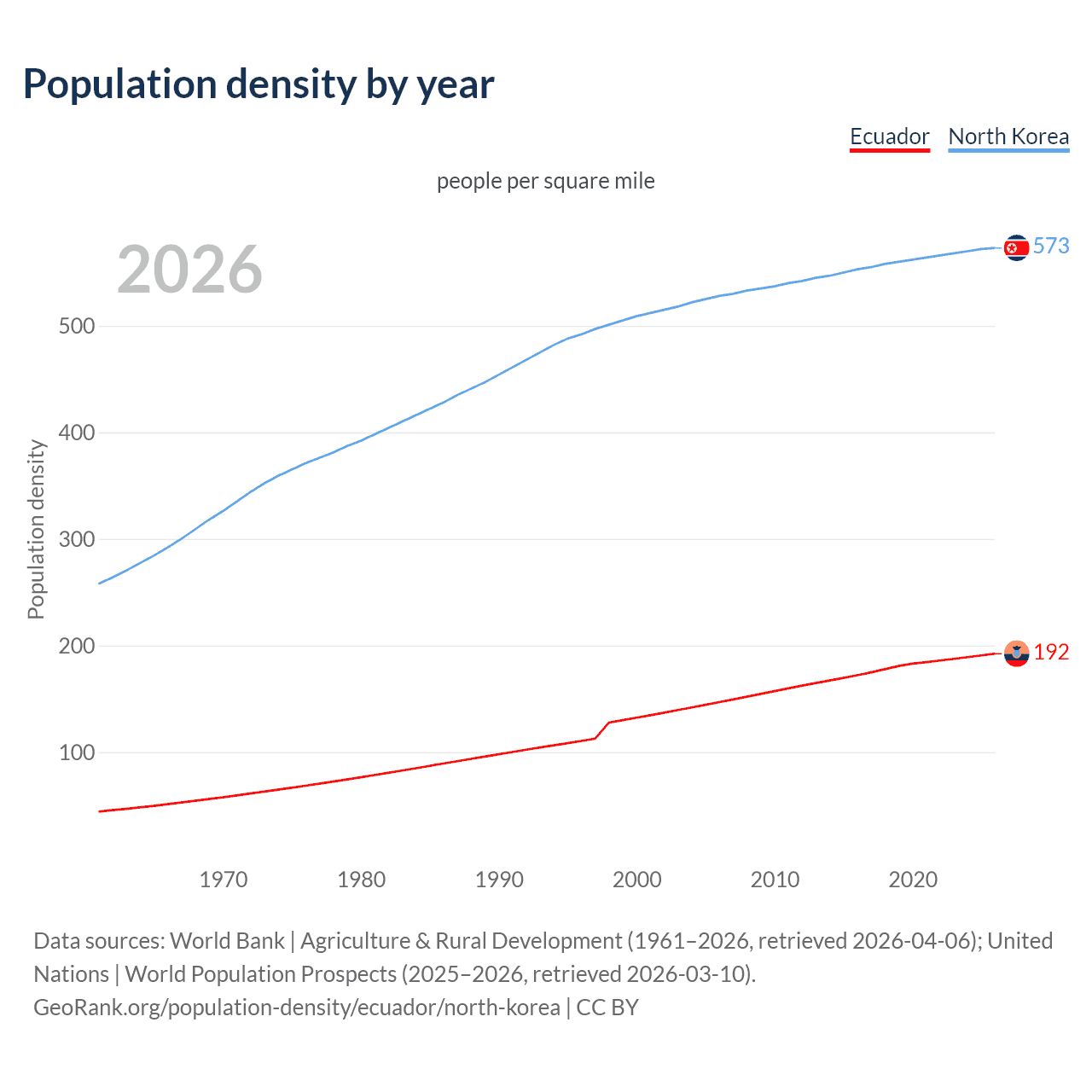 From 2006 to 2026, population density in Ecuador increased by 30.9%, compared to a 8.64% growth in North Korea.