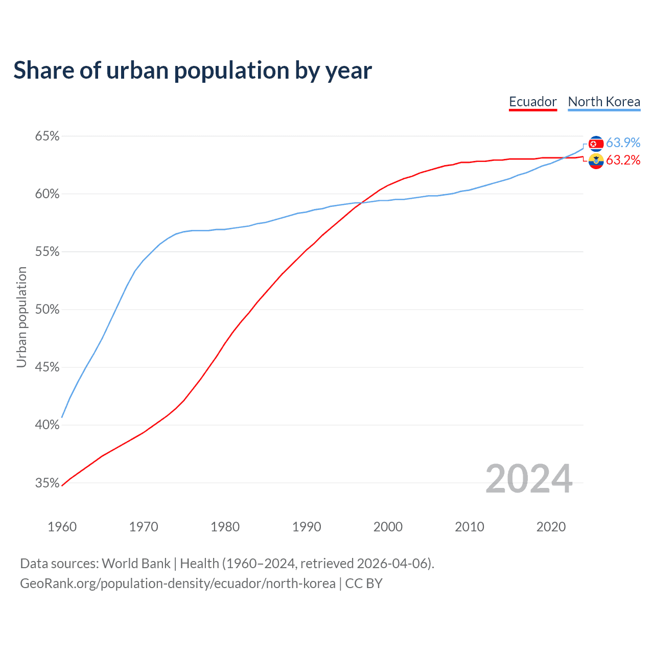 From 2004 to 2024, the share of urban population changed from 61.8% to 63.2% in Ecuador and from 59.7% to 63.9% in North Korea.