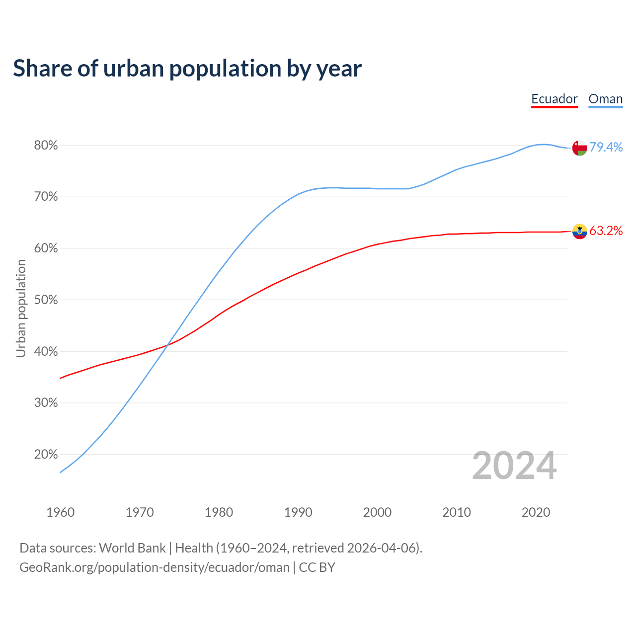 From 2004 to 2024, the share of urban population changed from 61.8% to 63.2% in Ecuador and from 71.5% to 79.4% in Oman.