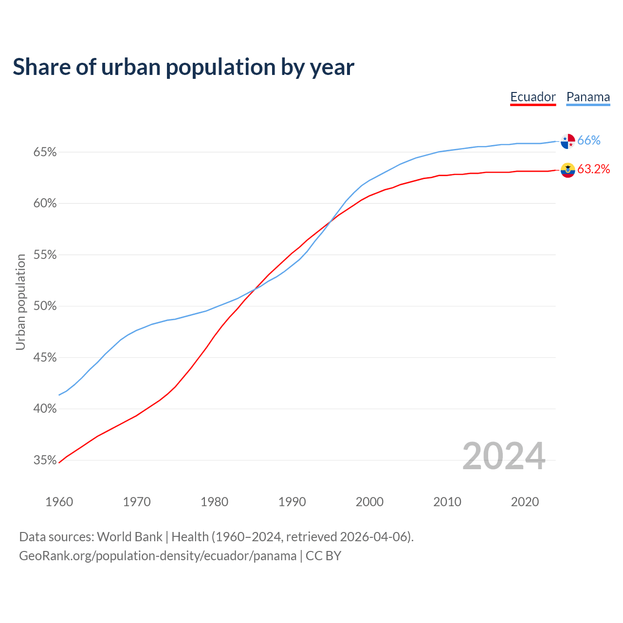 From 2004 to 2024, the share of urban population changed from 61.8% to 63.2% in Ecuador and from 63.8% to 66% in Panama.