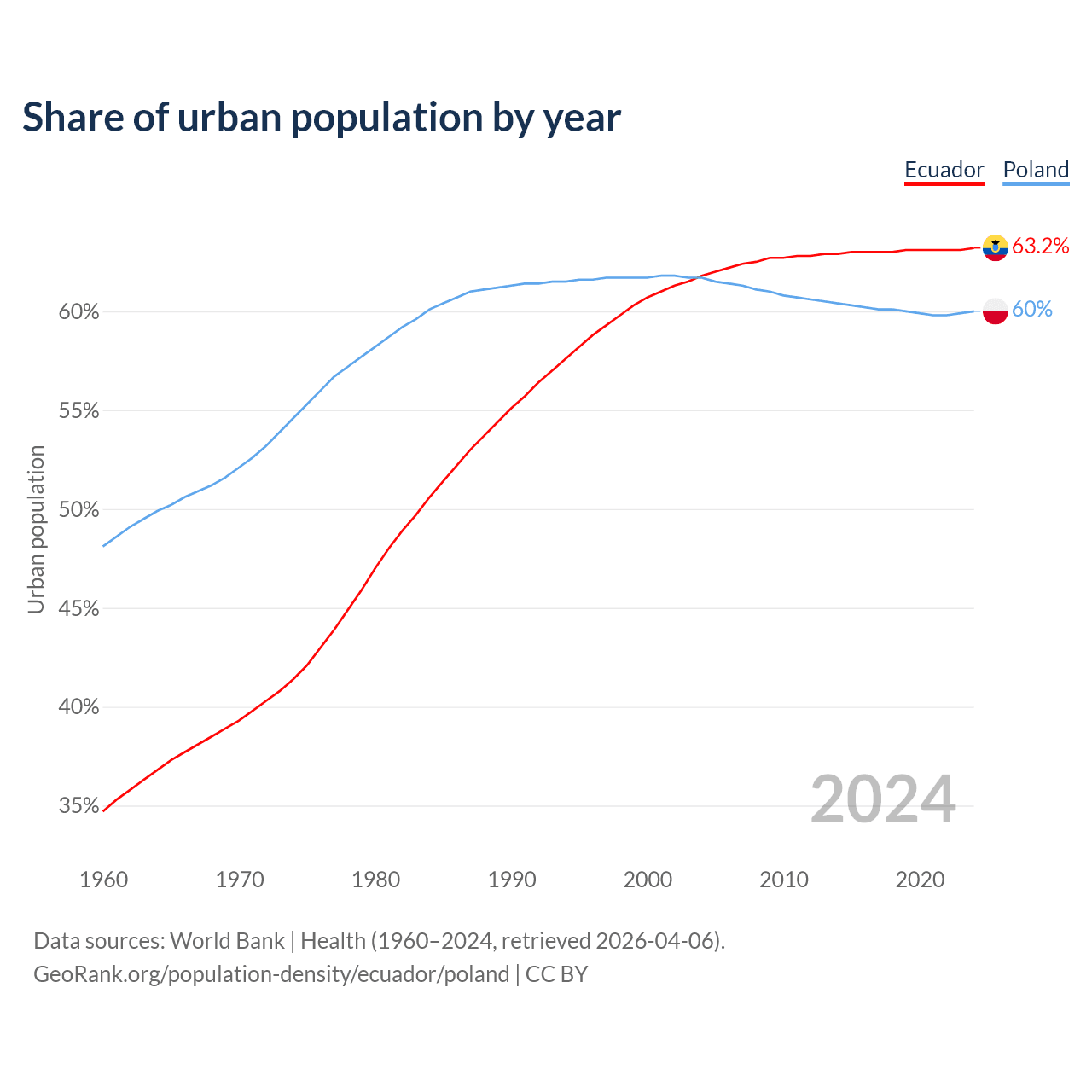 From 2004 to 2024, the share of urban population changed from 61.8% to 63.2% in Ecuador and from 61.7% to 60% in Poland.