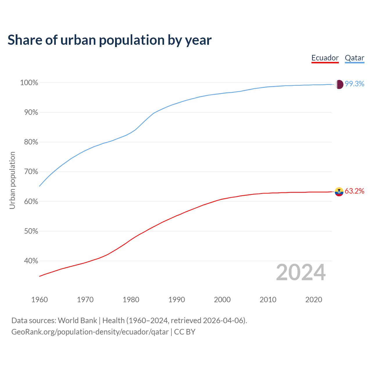 From 2004 to 2024, the share of urban population changed from 61.8% to 63.2% in Ecuador and from 97% to 99.3% in Qatar.