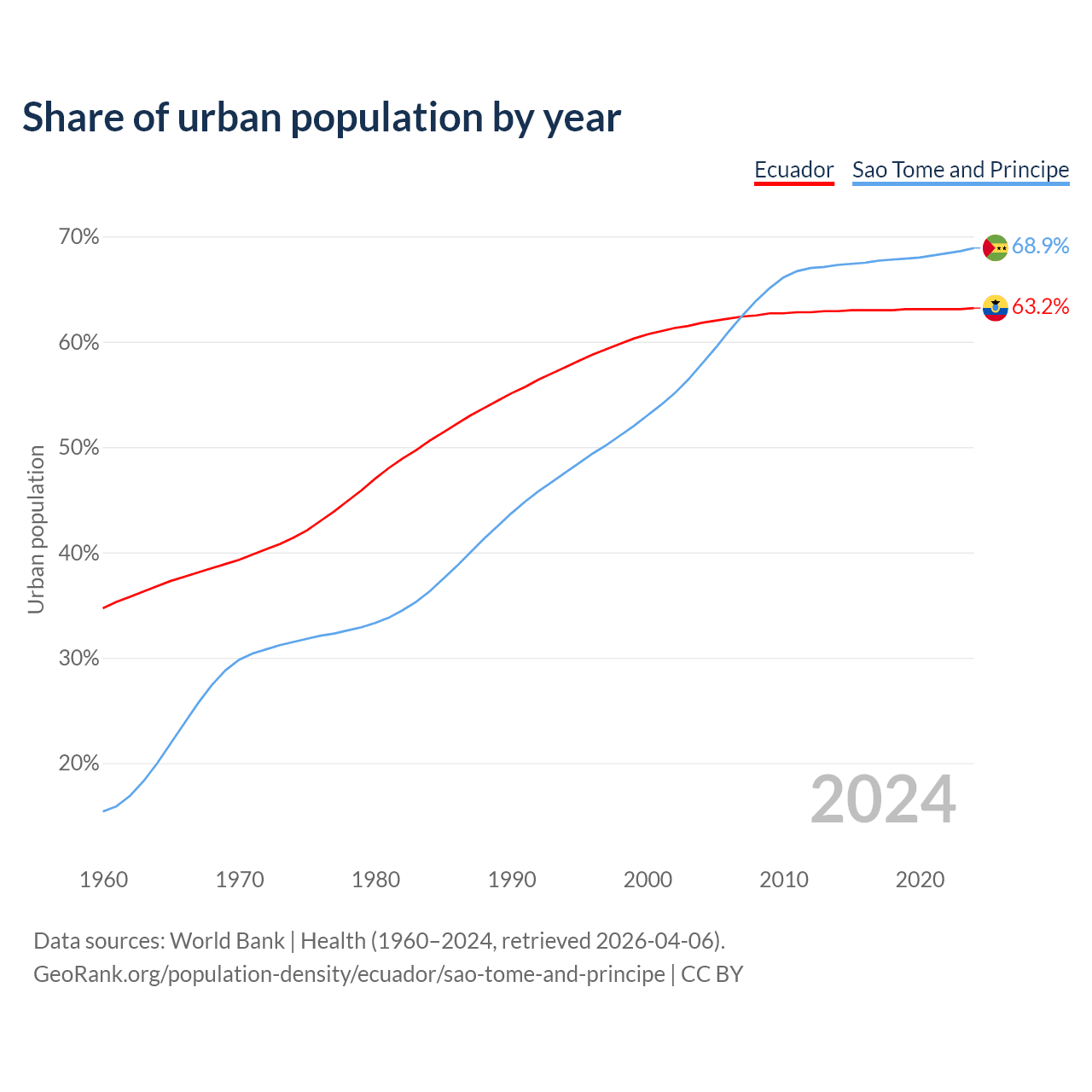 From 2004 to 2024, the share of urban population changed from 61.8% to 63.2% in Ecuador and from 57.9% to 68.9% in Sao Tome and Principe.