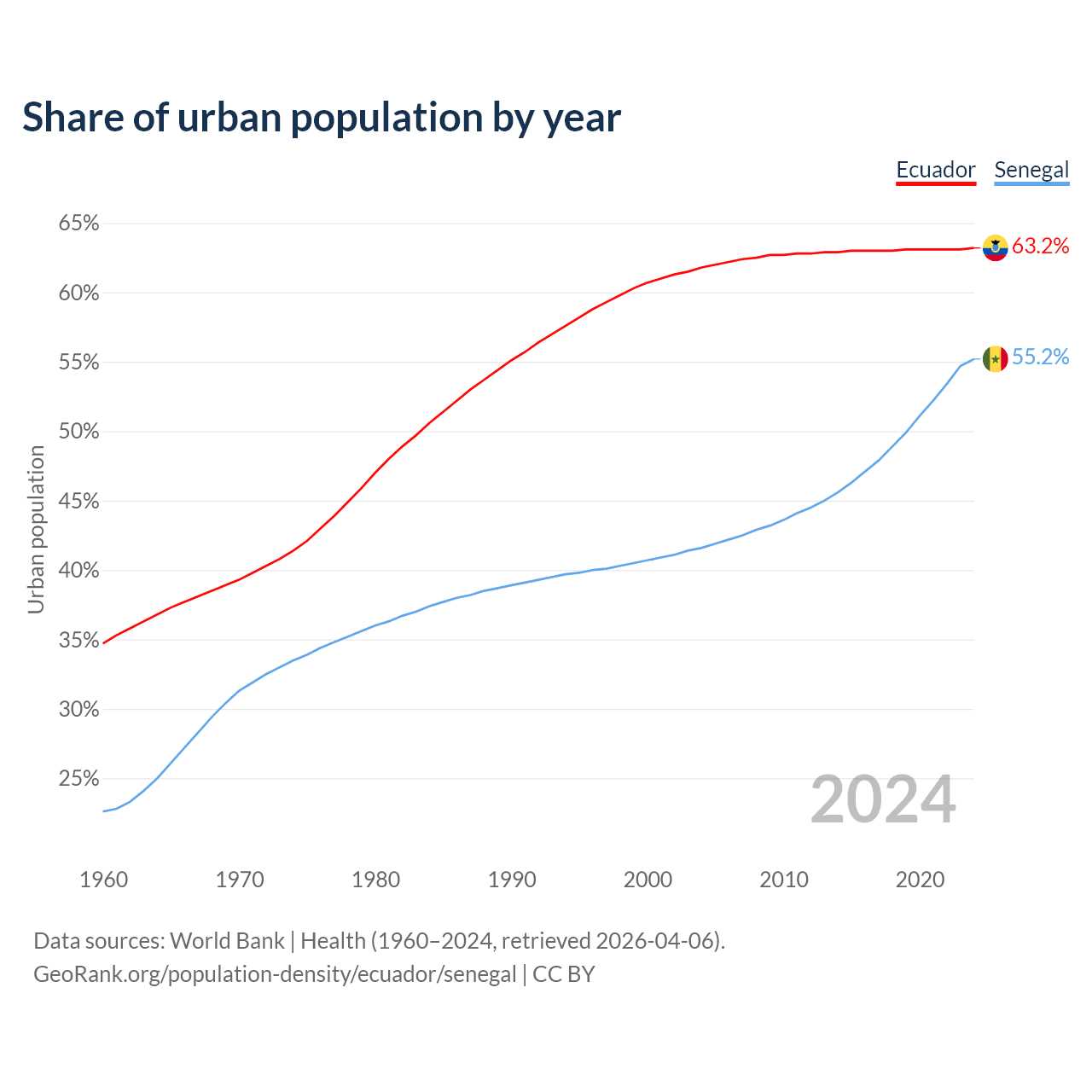 From 2004 to 2024, the share of urban population changed from 61.8% to 63.2% in Ecuador and from 41.6% to 55.2% in Senegal.