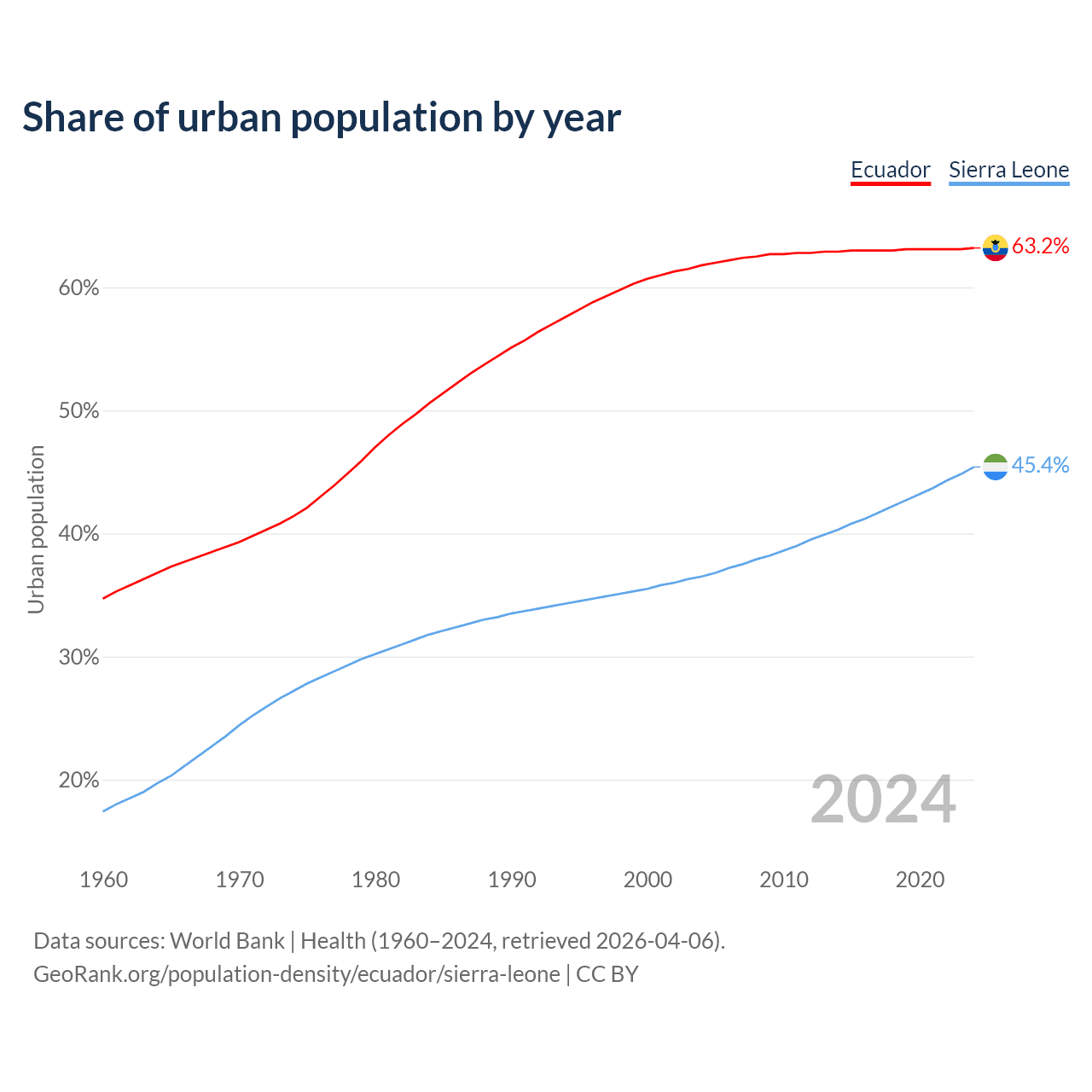 From 2004 to 2024, the share of urban population changed from 61.8% to 63.2% in Ecuador and from 36.5% to 45.4% in Sierra Leone.