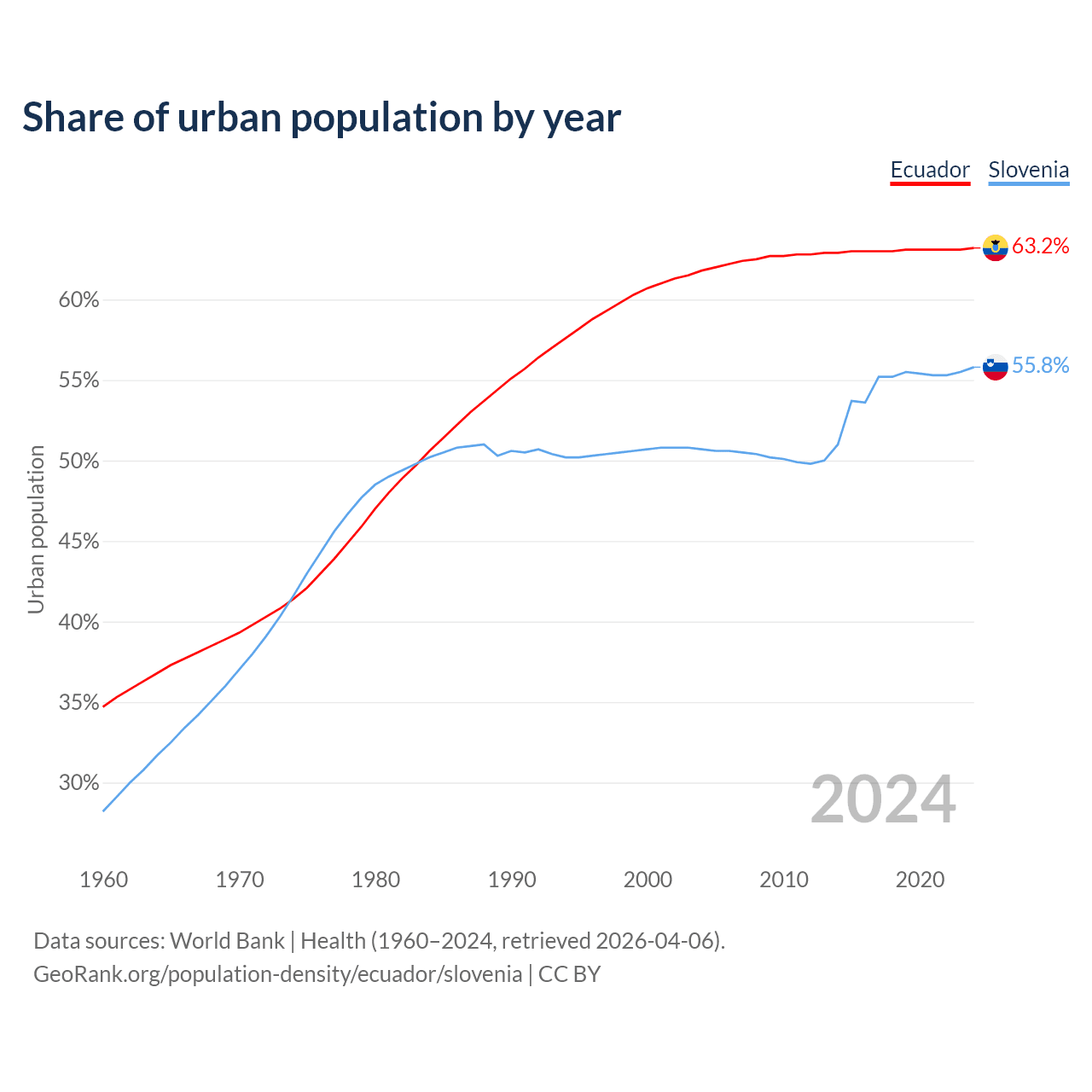 From 2004 to 2024, the share of urban population changed from 61.8% to 63.2% in Ecuador and from 50.7% to 55.8% in Slovenia.