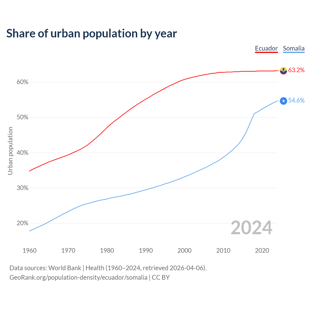 From 2004 to 2024, the share of urban population changed from 61.8% to 63.2% in Ecuador and from 35% to 54.6% in Somalia.