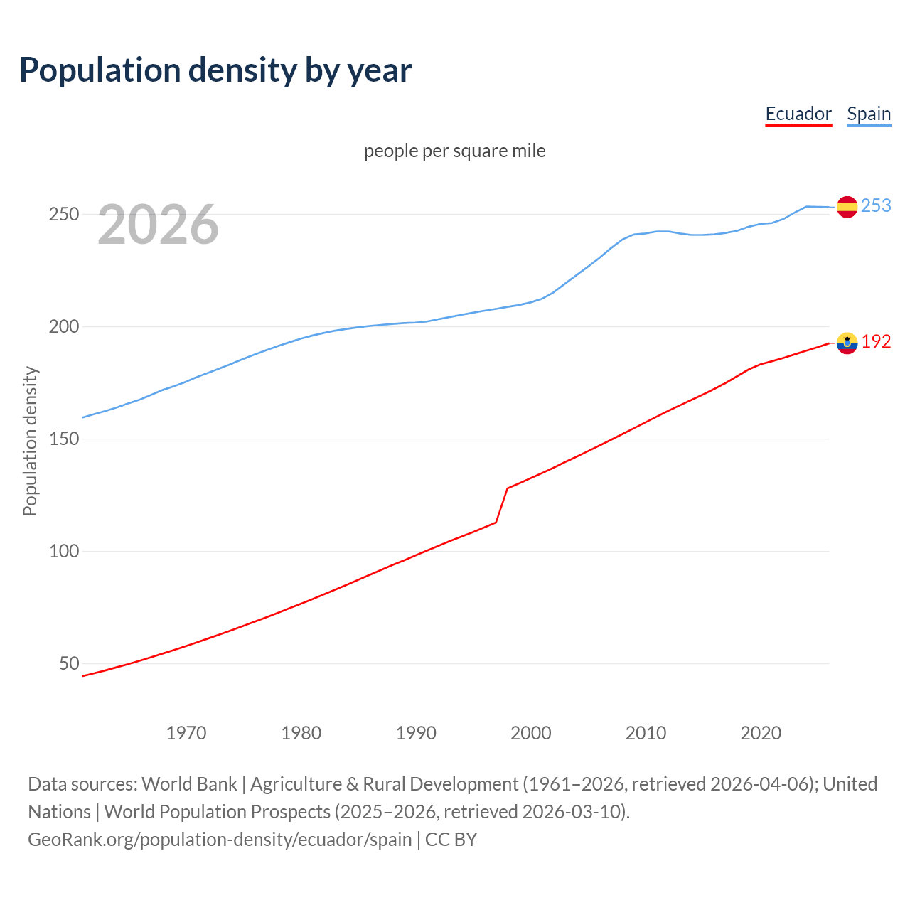 From 2006 to 2026, population density in Ecuador increased by 30.9%, compared to a 9.77% growth in Spain.