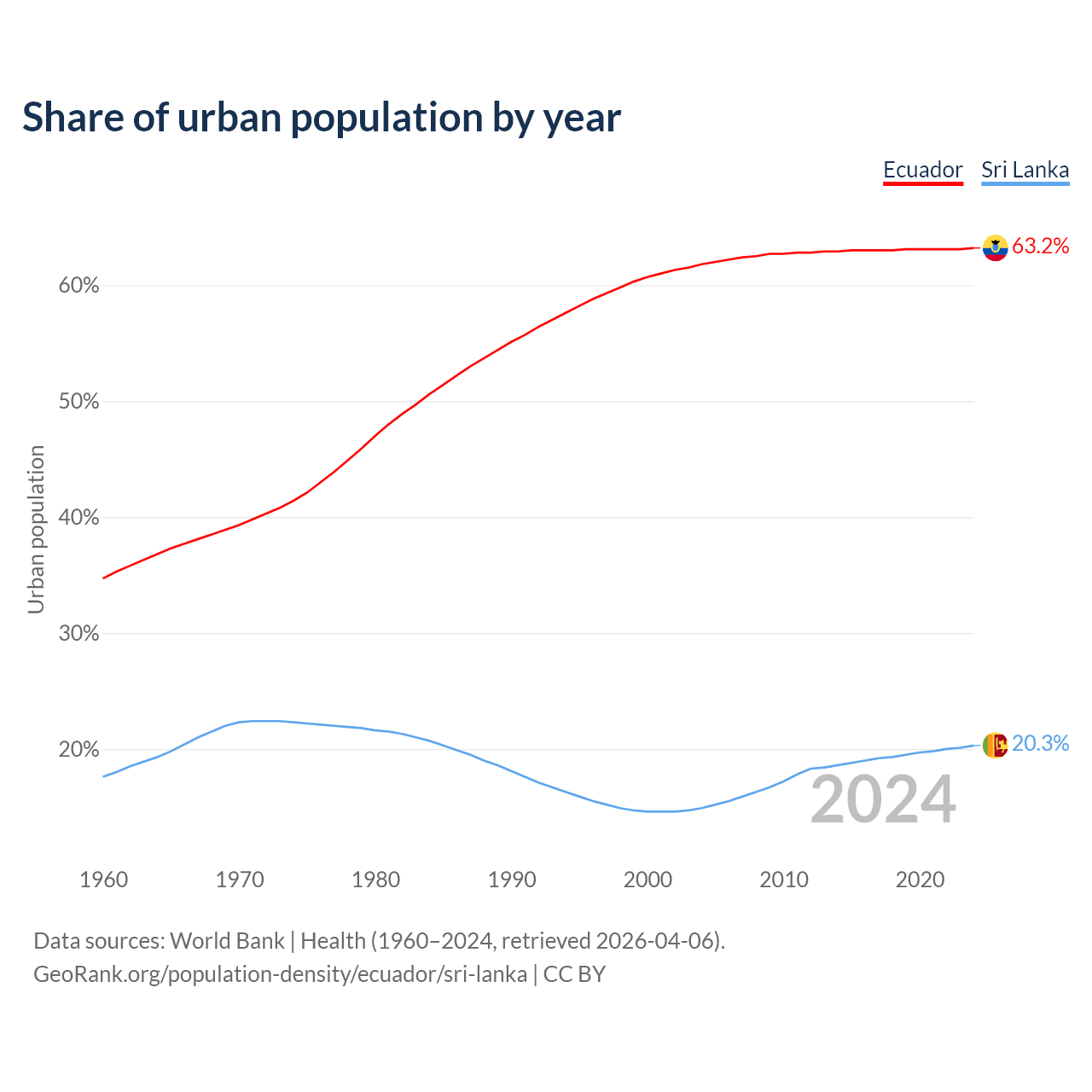 From 2004 to 2024, the share of urban population changed from 61.8% to 63.2% in Ecuador and from 14.9% to 20.3% in Sri Lanka.