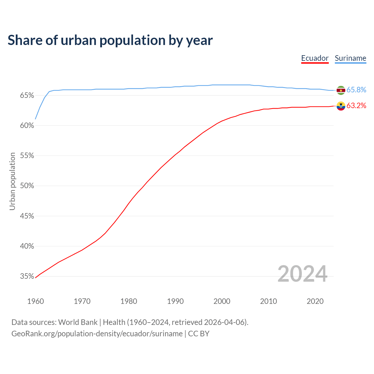 From 2004 to 2024, the share of urban population changed from 61.8% to 63.2% in Ecuador and from 66.7% to 65.8% in Suriname.