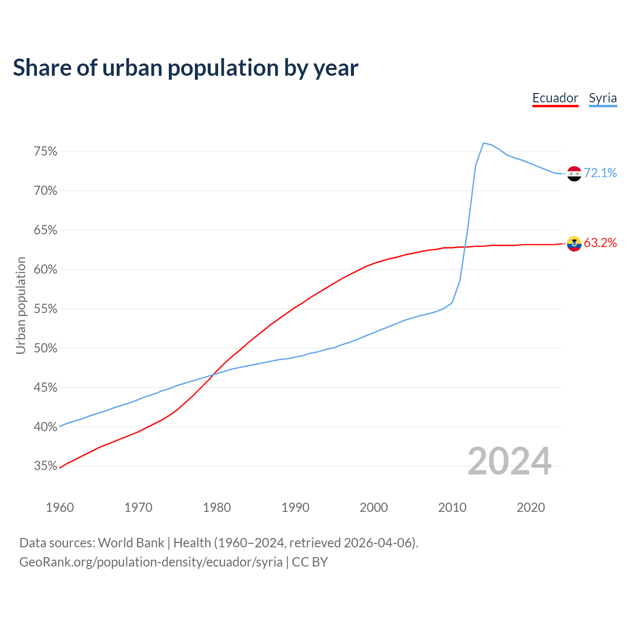 From 2004 to 2024, the share of urban population changed from 61.8% to 63.2% in Ecuador and from 53.5% to 72.1% in Syria.