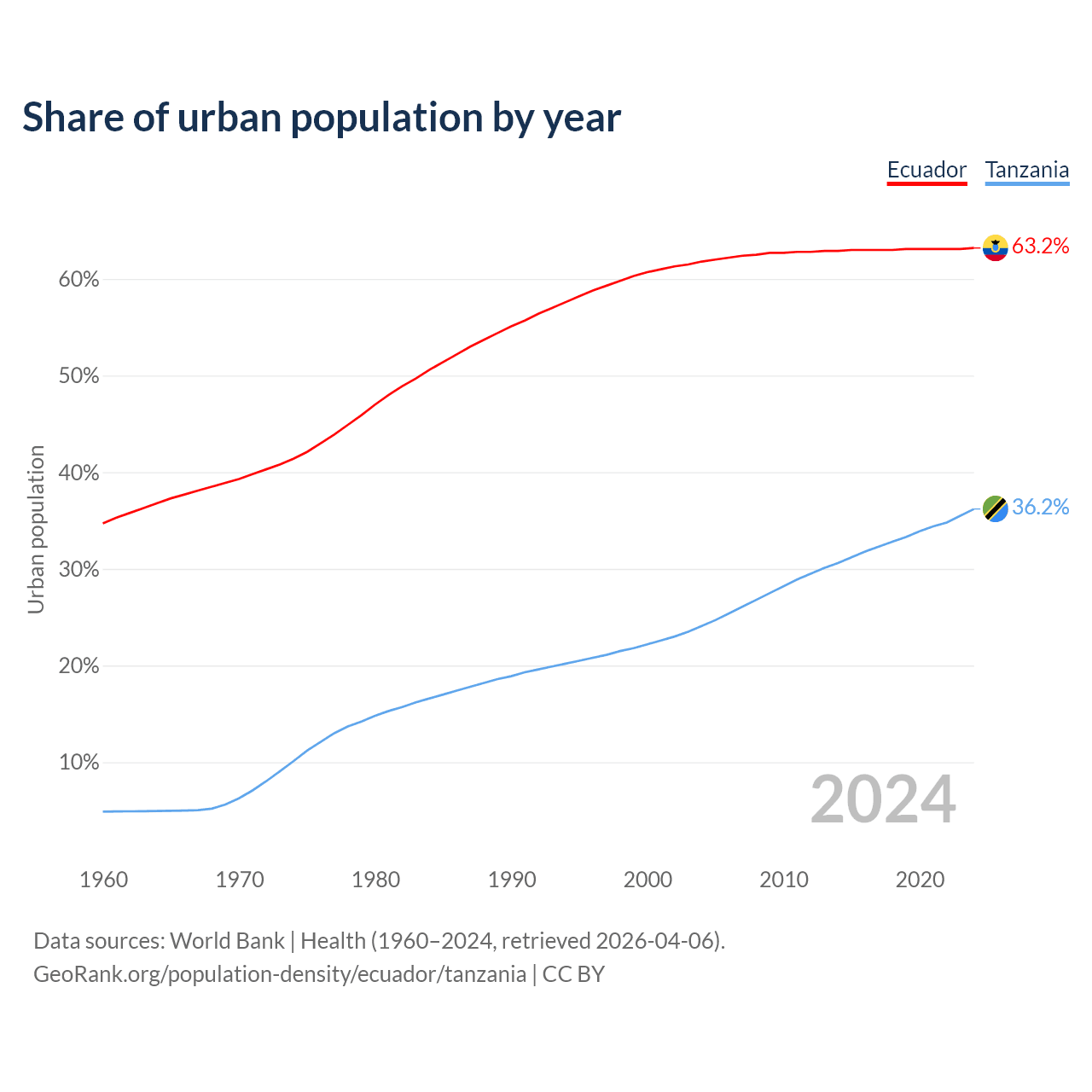 From 2004 to 2024, the share of urban population changed from 61.8% to 63.2% in Ecuador and from 24.1% to 36.2% in Tanzania.