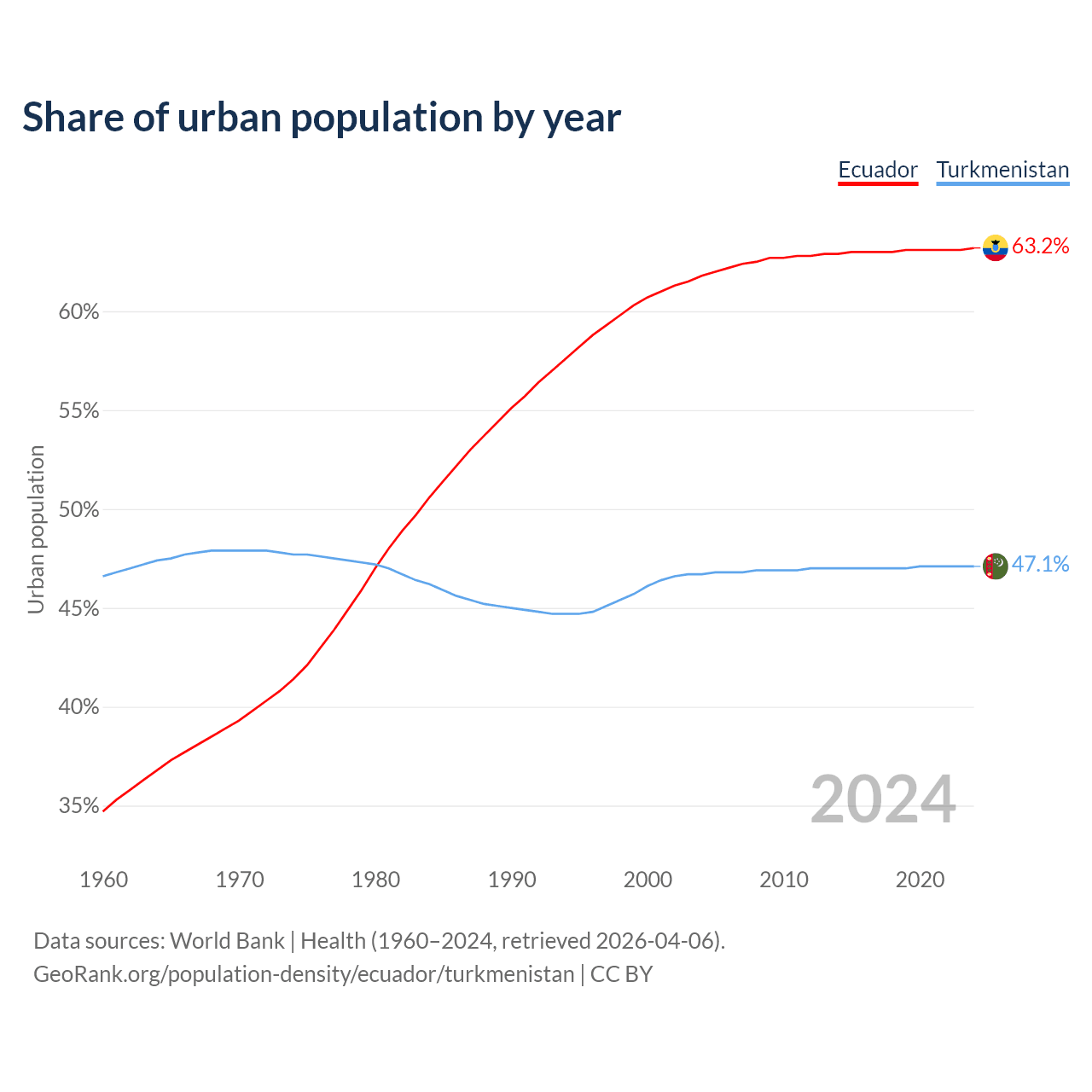 From 2004 to 2024, the share of urban population changed from 61.8% to 63.2% in Ecuador and from 46.7% to 47.1% in Turkmenistan.