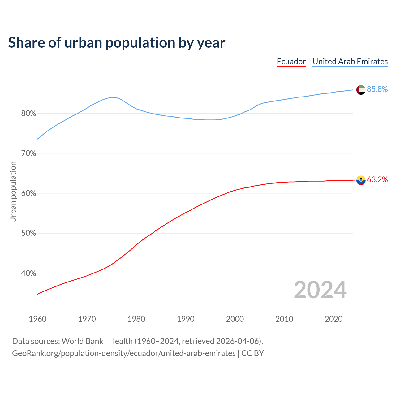 From 2004 to 2024, the share of urban population changed from 61.8% to 63.2% in Ecuador and from 81.5% to 85.8% in the United Arab Emirates.