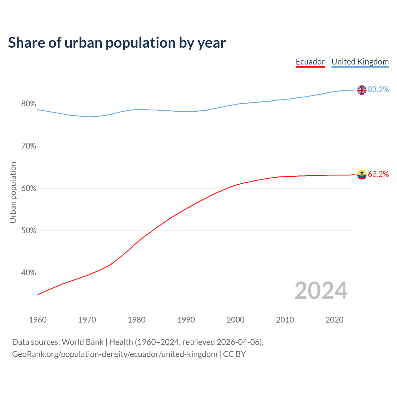From 2004 to 2024, the share of urban population changed from 61.8% to 63.2% in Ecuador and from 80.3% to 83.2% in the United Kingdom.